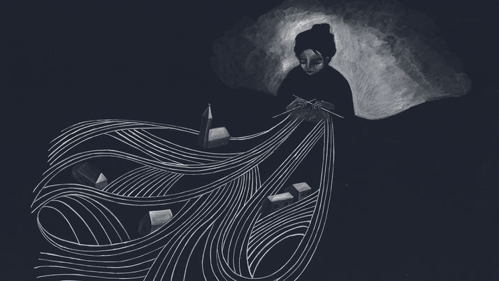 Actor Jeroen Lenaerts brings The Wolfman to life in a gripping narrative. MANdolinMAN and electronica wizard Mathijs Bertel (Ansatz Der Maschine) enliven the performance with old melodies that, through added samples, beats, and soundscapes, sound young and fresh. Illustrations by Lot Vandekeybus are projected behind the actor and musicians, white images on a black background to avoid backlighting onstage.